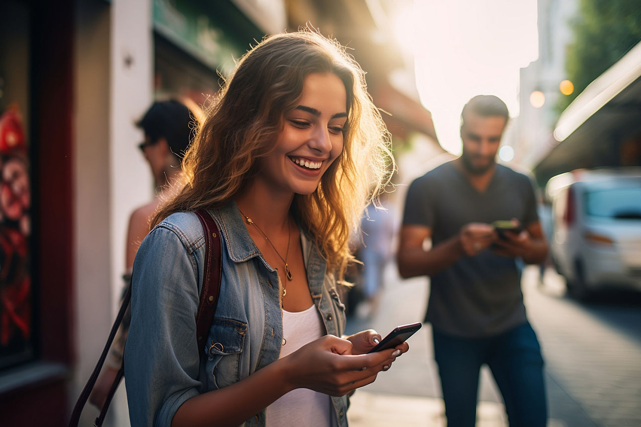 Eine Geschäftsfrau schaut lächelnd auf ihr Smartphone